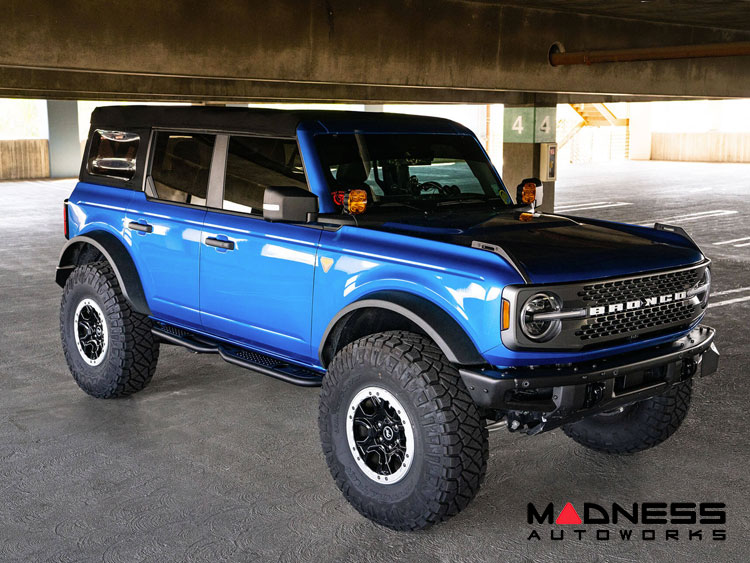 Installation is simple, and there are no modifications or drilling required. The steps are finished with a micro-texture black powder coat to flow with the style of the Bronco’s trim, and to prevent rust. These will clear up to 38-inch tires.