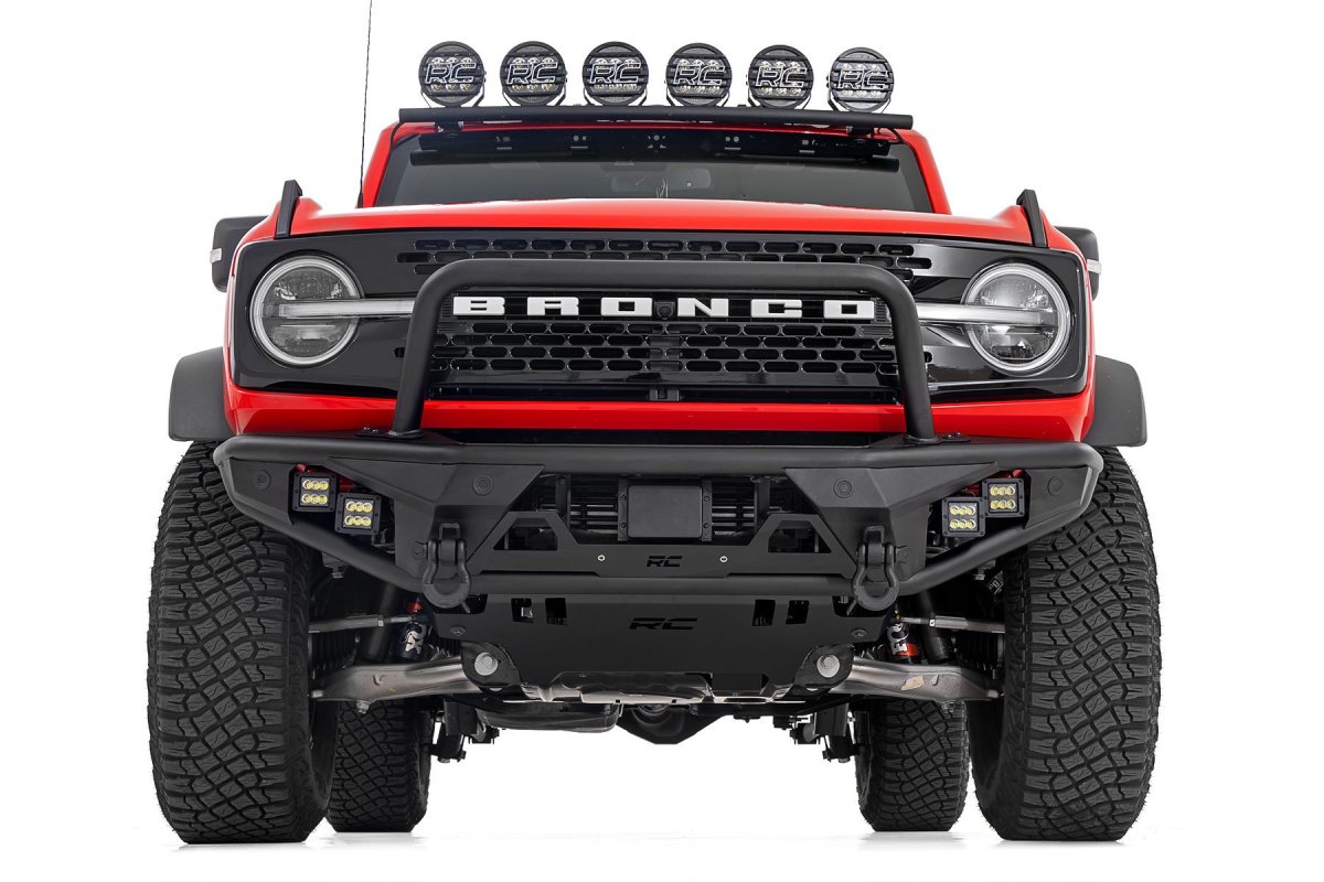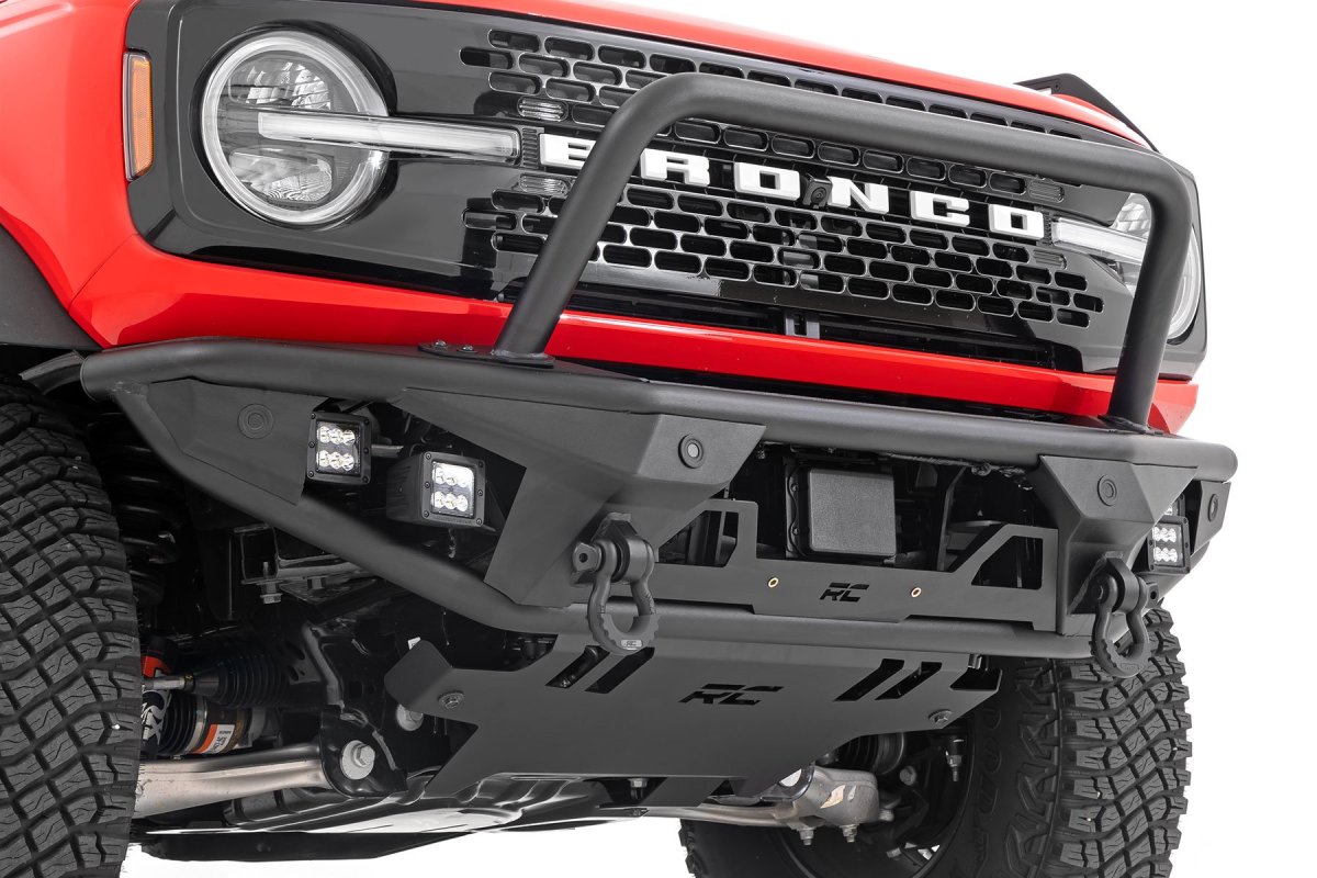 Engineered with precision, the Rough Country Front Bumper is a testament to durability and performance. Its robust construction features 2-inch diameter tubing that not only provides a durable shield against debris but also augments the Bronco’s tough aesthetic. The Satin Black finish ensures this bumper maintains its sleek look over time, resisting chipping and fading. The bumper includes a D-ring set with a formidable 4.75-ton capacity, ensuring your Bronco is always prepared for trail rescue operations. An integrated skid plate provides additional protection from underbody damage, while the bolt-on stinger bar adds an extra layer of front-end defense. With all these elements combined, your Bronco becomes an indomitable force capable of handling steep and rocky paths with ease.