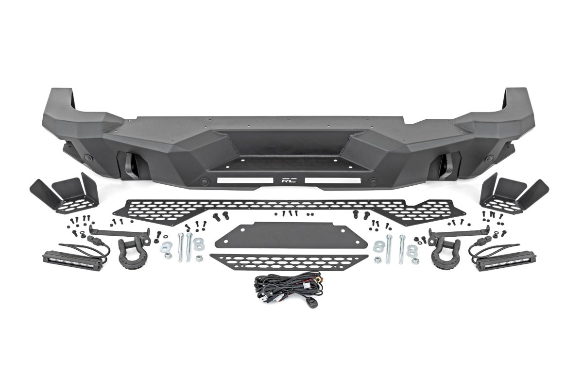 The Ford Bronco Rear Bumper - Rough Country - Black Series LED | Slim Line - Black - '21-'23 is an exceptional addition to any 2021-2023 Ford Bronco, designed to provide both improved protection and an enhanced look for serious off-road enthusiasts. This rugged bumper not only replaces the OEM bumper but goes a step further, offering increased off-road protection with its extended design and strong construction.