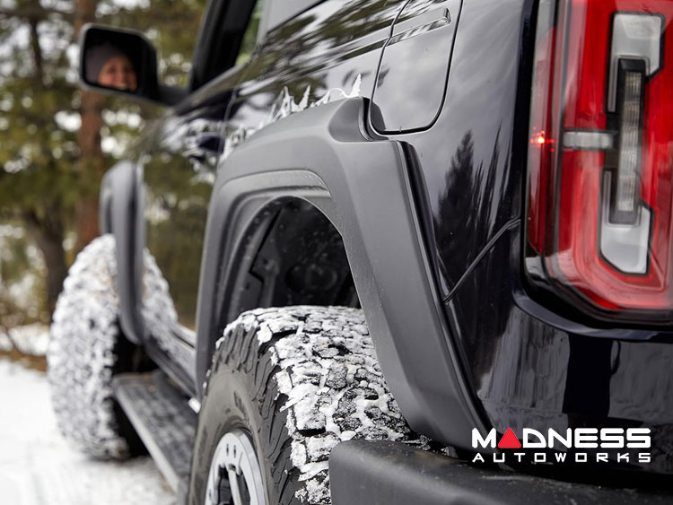 Crafted from UV-stable thermoformed material, these Fender Flares are both flexible and shatter-proof. This ensures durable performance, even under the most challenging conditions. Complementing the sturdy design is the stainless steel hardware, which offers robust resistance against corrosion. The rugged two-piece design adds increased stability, making your Bronco not just look good but also function exceptionally well.