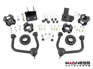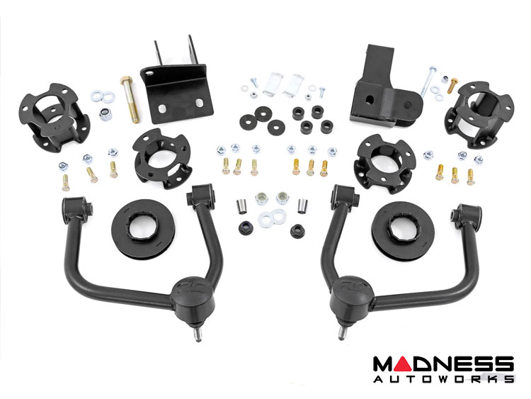 This suspension kit provides everything needed to lift your vehicle, giving you increased ground clearance to run larger tires while reducing the nose-down factory look for a commanding presence.