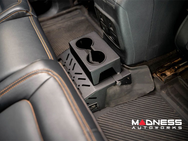 Installation is straightforward but might involve minor trimming of OEM and after-market floor mats. The modular nature of the design ensures that if you need to fold down the back seats, the cup holder can be easily removed by unscrewing the stainless steel knobs, leaving you with just the molle panels if you still require their utility.