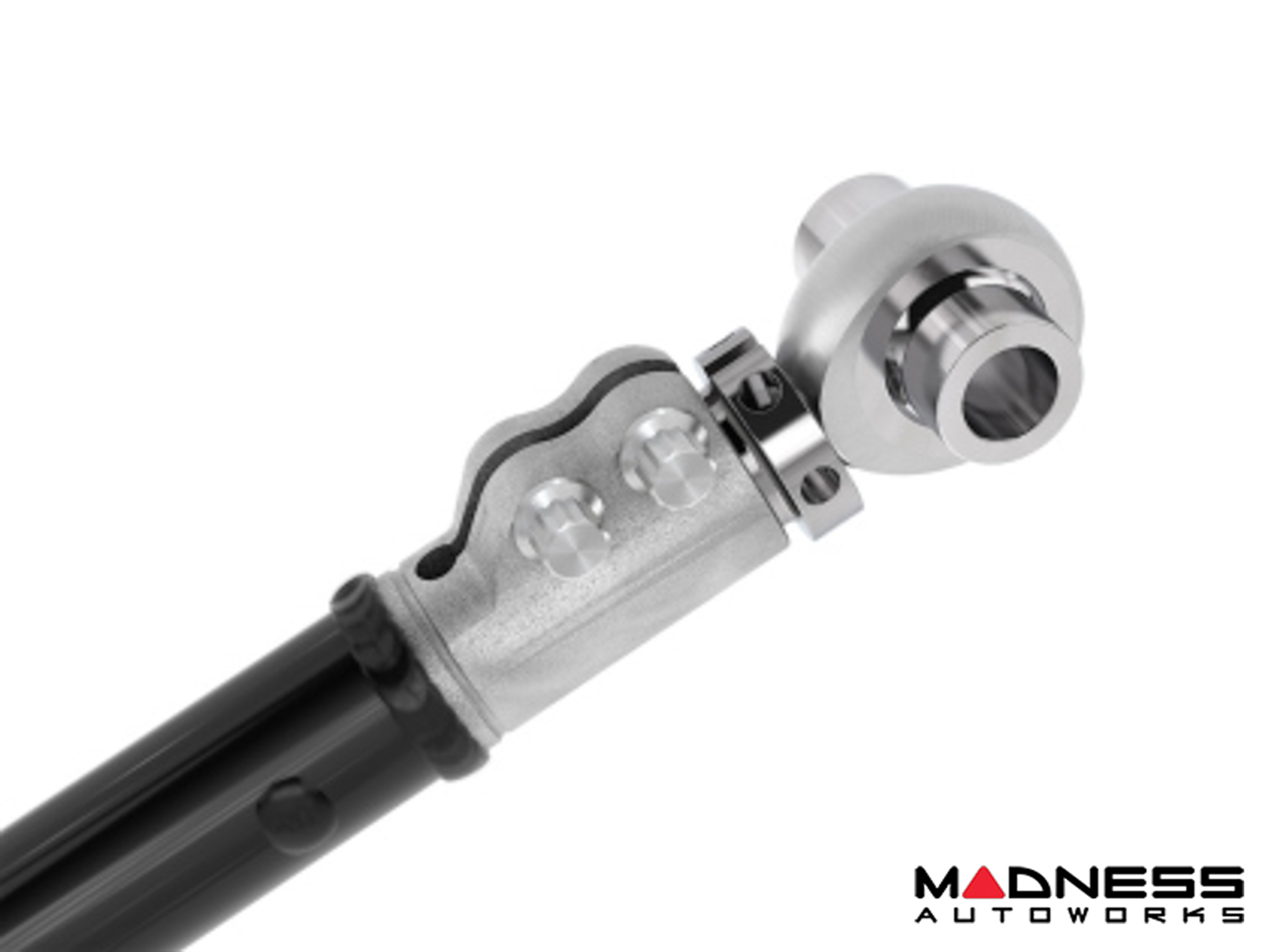 This allows for easy correction of axle location and dialing in precise tracking whenever adjustments are made to ride height. The track bar is made of CNC bent 1¼ x .250 wall 1026 DOM tubing with CNC machined threaded end and bushing housing. It has a multi-stage black powder coat finish.