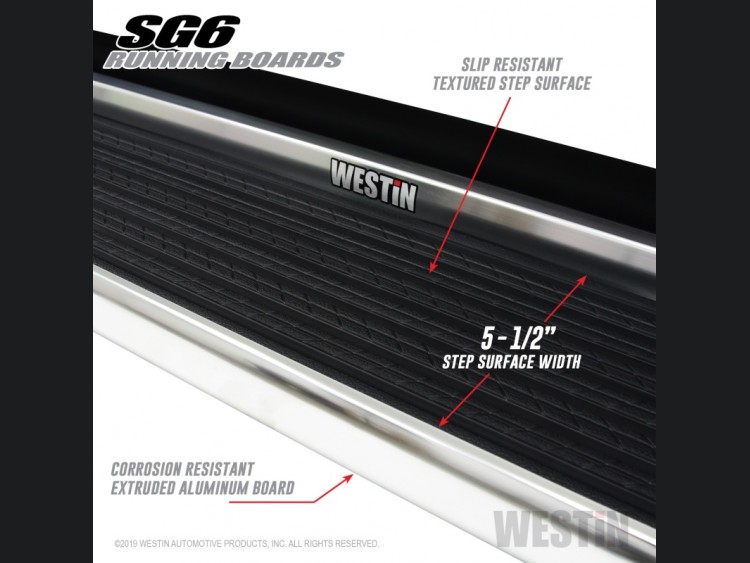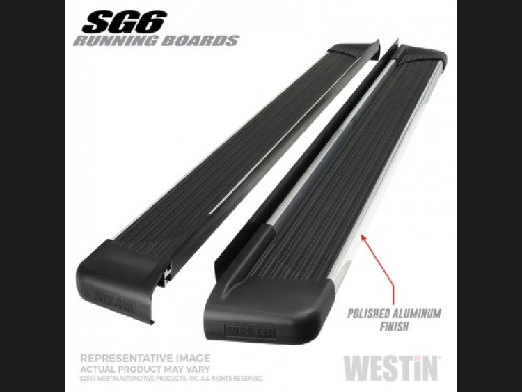 SG6 Running Boards also include a rocker panel gap strip to provide users with the appropriate Westin finished look. A polished aluminum finish with a protective anodized coating prevents oxidation increasing durability and extending product life.