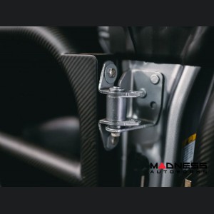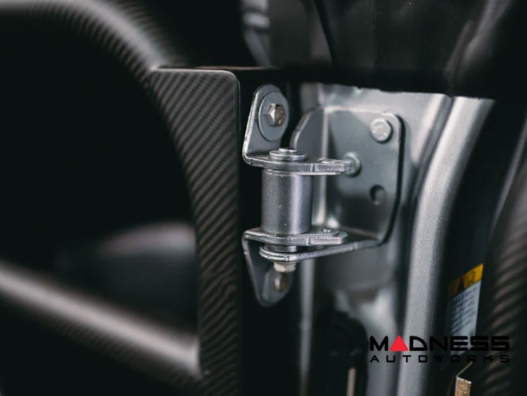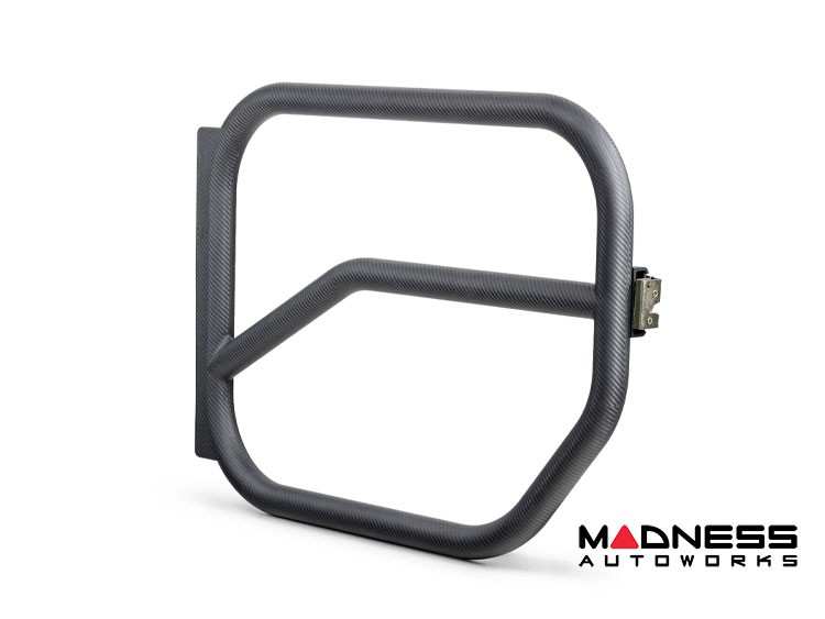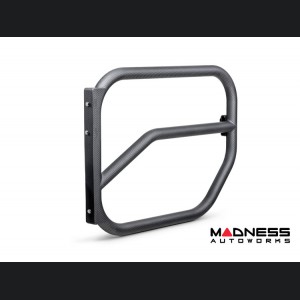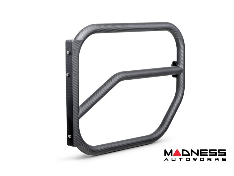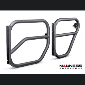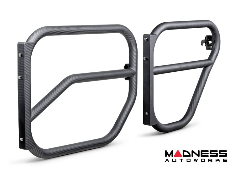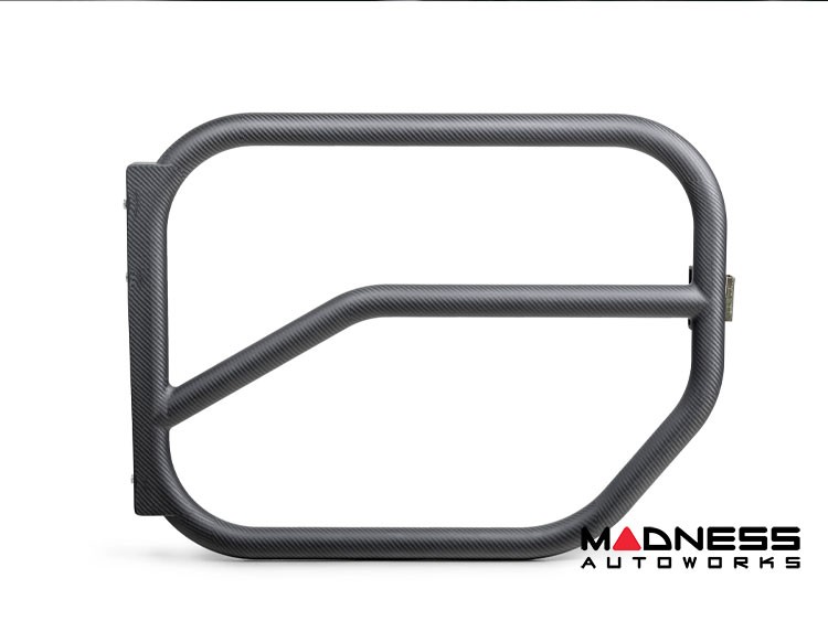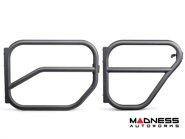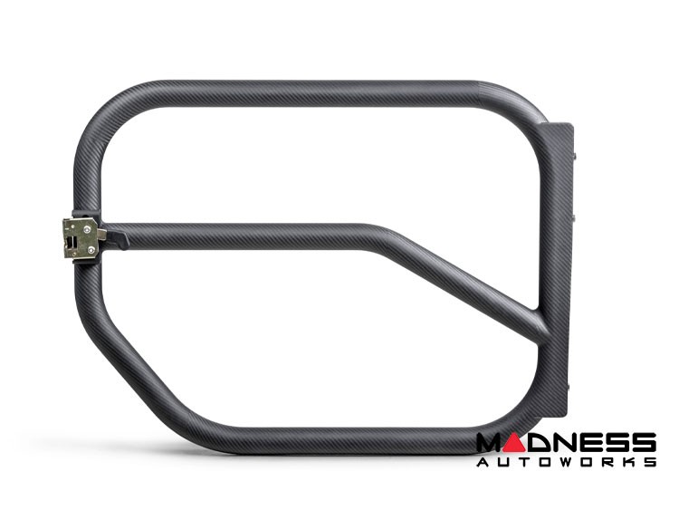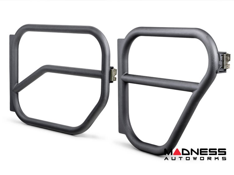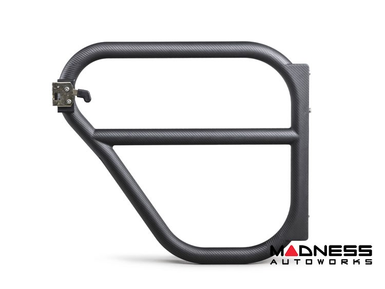 Ideal for off-road use, these doors are not recommended for street use, and they do not come with locations for OE interior panels, accessories, or glass. Please note that DRY carbon lacks UV protection, thus it is advisable to coat them with an automotive grade clear coat with UV inhibitors unless you plan to paint or wrap the parts. Some modifications to mounting tabs may be required to ensure a perfect fit, with minor adjustments typical during installation.