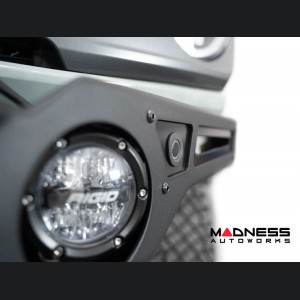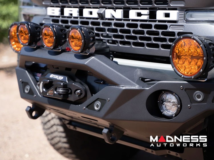 Versatile Off-Road Lighting Options: Illuminate your path with a range of off-road lighting choices. The bumper features (2) 3-4 inch round light mounts, providing ample space for lighting customization. Additionally, you'll find (2) light mounts on top of the bumper wings, perfect for accommodating up to 6-inch round lights. The angular bull bar further enhances your lighting options with (3) light mounts, accommodating powerful 6-inch round lights for enhanced visibility.