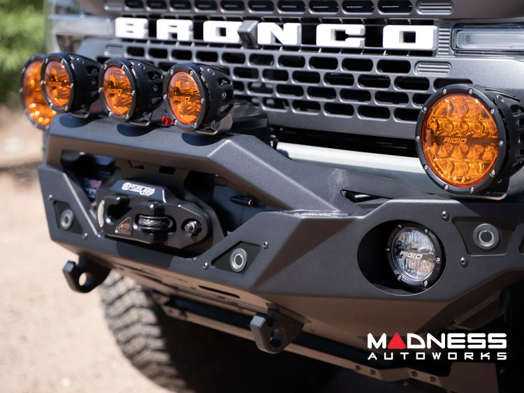 Versatile Off-Road Lighting Options: Illuminate your path with a range of off-road lighting choices. The bumper features (2) 3-4 inch round light mounts, providing ample space for lighting customization. Additionally, you'll find (2) light mounts on top of the bumper wings, perfect for accommodating up to 6-inch round lights. The angular bull bar further enhances your lighting options with (3) light mounts, accommodating powerful 6-inch round lights for enhanced visibility.