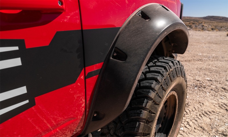Each Pocket Style Fender Flare is custom-designed for your Bronco, ensuring a seamless integration with oversized tires and high-clearance lift kits. Whether you're embarking on an off-road adventure or simply want a commanding presence on the street, these flares make an impact straight out of the box. Their OEM-style matte black finish is not only tough and rugged but also UV-protected to prevent chalking. Alternatively, you can easily paint them to customize or match your Bronco's body color, giving you the option for a factory-custom look.