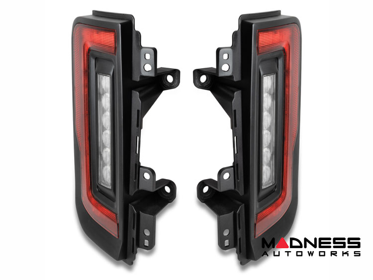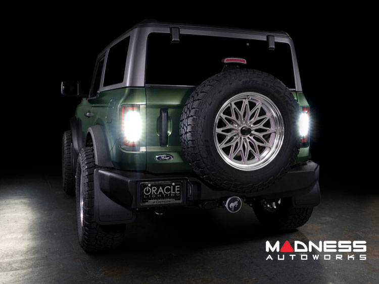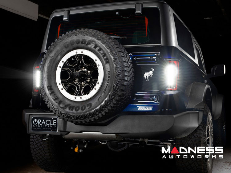 No more problems backing up at night because these LED reverse lights are basically a pair of LED light bars mounted into the tail light which will provide over 8,000 Lumens of rear-facing illumination. This innovative design wraps tightly around the truck. Because of the nearly flush wrap-around design, the lighting can be visible from any rear angle, making it a unique solution for the Bronco.
