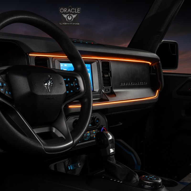 Transform your Bronco’s Interior with Fully Dynamic LED Dash Lighting! Bring your 2021-2025 Ford Bronco’s cabin to life with the ORACLE Lighting Dynamic ColorSHIFT® LED Dash Strip Kit. Designed to perfectly complement the rugged yet modern Bronco interior, this premium lighting upgrade adds immersive, customizable lighting with no complicated wiring or permanent modifications required. The ultra-slim, flexible LED strips conform seamlessly to the Bronco’s dash contours, delivering a clean, factory-installed look. Installation is effortless simply connect to a USB power source and start customizing. With ORACLE’s advanced Dynamic ColorSHIFT® technology, you get more than just solid colors. Choose from pre-programmed moving patterns, static color modes (including pure white), and even create your own personalized lighting effects with full pixel editing in the free LED LAMP app (select “LED-DMX00-XXX” in the app to pair your system). Adjust color, speed, brightness, and color transitions to match your mood, style, or driving experience. Control your lighting easily using either the included wireless remote or the smartphone app. Whether you want subtle accent lighting or a dynamic show-stopping display, the ORACLE Dash Kit delivers unmatched versatility and modern style.. In the Box: (2) Dynamic ColorSHIFT® RGB LED Dash Strips, (1) USB Connection Hub, (1) Wireless Remote, (1) Installation Tool, (1) Roll of 3M Double Sided Adhesive. Custom Pixel Editing: Create your own dynamic color patterns with adjustable speed, brightness, color transitions, and blending in the LED LAMP app. Easy Installation: Includes everything needed: LED strips, controller, 3M adhesive mounting tape, USB power cable, installation tool, and remote. Flexible, Low-Profile Design: Ultra-slim LED strips conform perfectly to Bronco’s dash contours for a seamless factory-style fit. Dual Control Options: Wireless handheld remote or smartphone control via the free LED LAMP app (pair with “LED-DMX00-XXX”). Product Specs: Diameter: 2mm, Lifetime: 20,000 hours of use, Material: Polymer, Voltage: USB 5V, Warranty: 1 Year. Dynamic ColorSHIFT® Technology: Pre-programmed moving patterns, static color modes, and pure white option. Simple USB Power: Plug-and-play connection to your vehicle’s USB port—no hardwiring required. Adjustable Brightness & Speed: Fine-tune lighting output to suit your mood or environment. ORACLE Lighting Ford Bronco Dynamic ColorSHIFT LED Interior Dash Board Kit w/ Controller. Oracle 21-25 Ford Bronco ColorSHIFT LED Interior Dash Board Kit. Ford Bronco Dynamic ColorSHIFT LED Interior Dash Board Kit. Dash Fiber Optic Light Strip. ColorSHIFT Dynamic