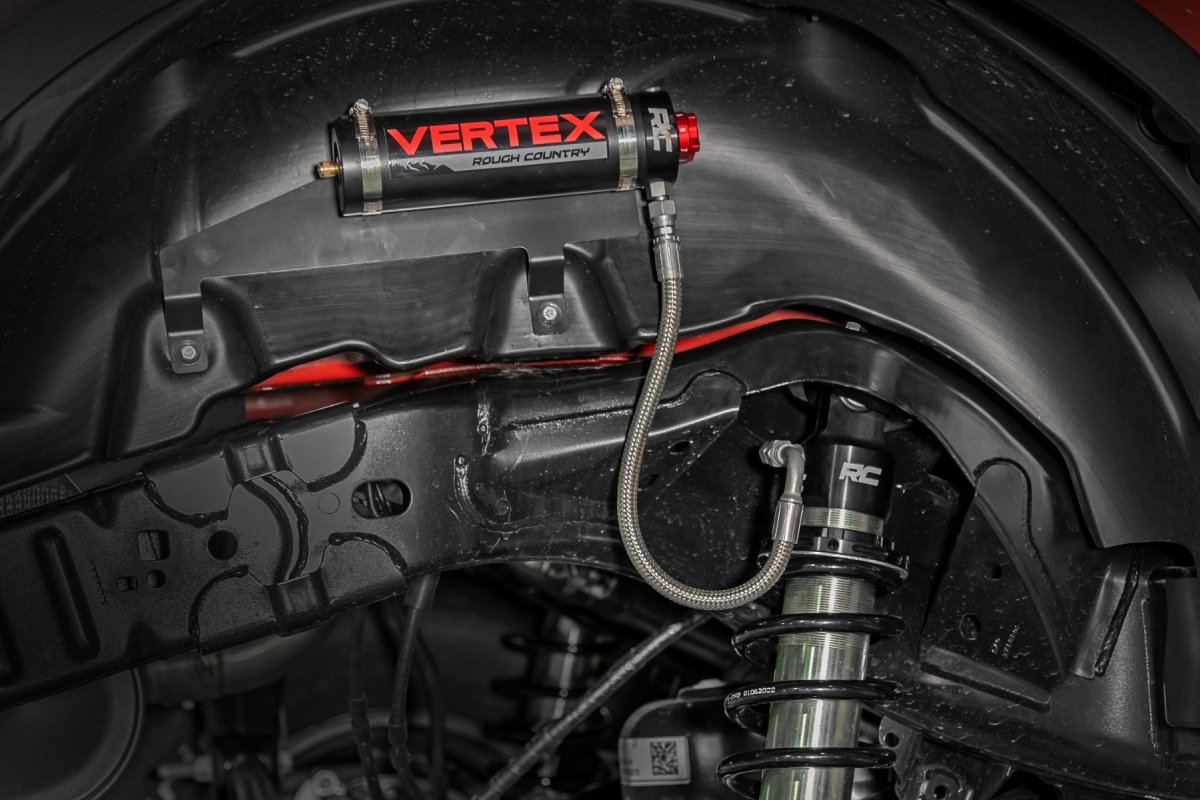 Experience superior handling and versatility with Rough Country's 2.5 Vertex Coilovers, featuring an 8-stage adjustable damping system. Whether you're navigating city streets or tackling rugged off-road trails, these coilovers allow you to customize your ride's comfort and performance with a simple turn of the dial. Built for extreme conditions, they boast a robust monotube design with an external remote reservoir. This means increased oil capacity and superior heat dissipation, which enhances damping sensitivity and reduces shock fade under heavy loads, ensuring dependable performance.